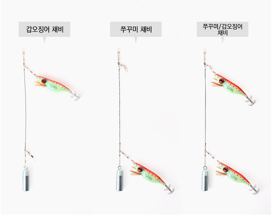 - 양핀도래: 양핀도래를 사용할 경우, 낚시 중에 단차를 조절할 수 있습니다. 단차가 짧을 경우, 갑오징어 포인트에서는 반응이 좋을 때가 많습니다. 반면, 단차가 길면 바닥에서 액션을 주기가 용이합니다.