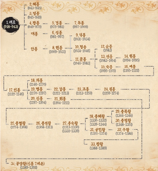 키워드: 고려 왕조, 고려 왕 계보, 태조 왕건, 혜종, 정종, 광종, 경종, 성종, 목종, 현종, 덕종, 문종, 순종, 선종, 헌종, 숙종, 예종, 인종, 의종, 명종, 신종, 희종, 강종, 고종, 원종, 충렬왕, 충선왕, 충숙왕, 충혜왕, 충목왕, 충정왕, 공민왕, 우왕, 창왕, 공양왕.