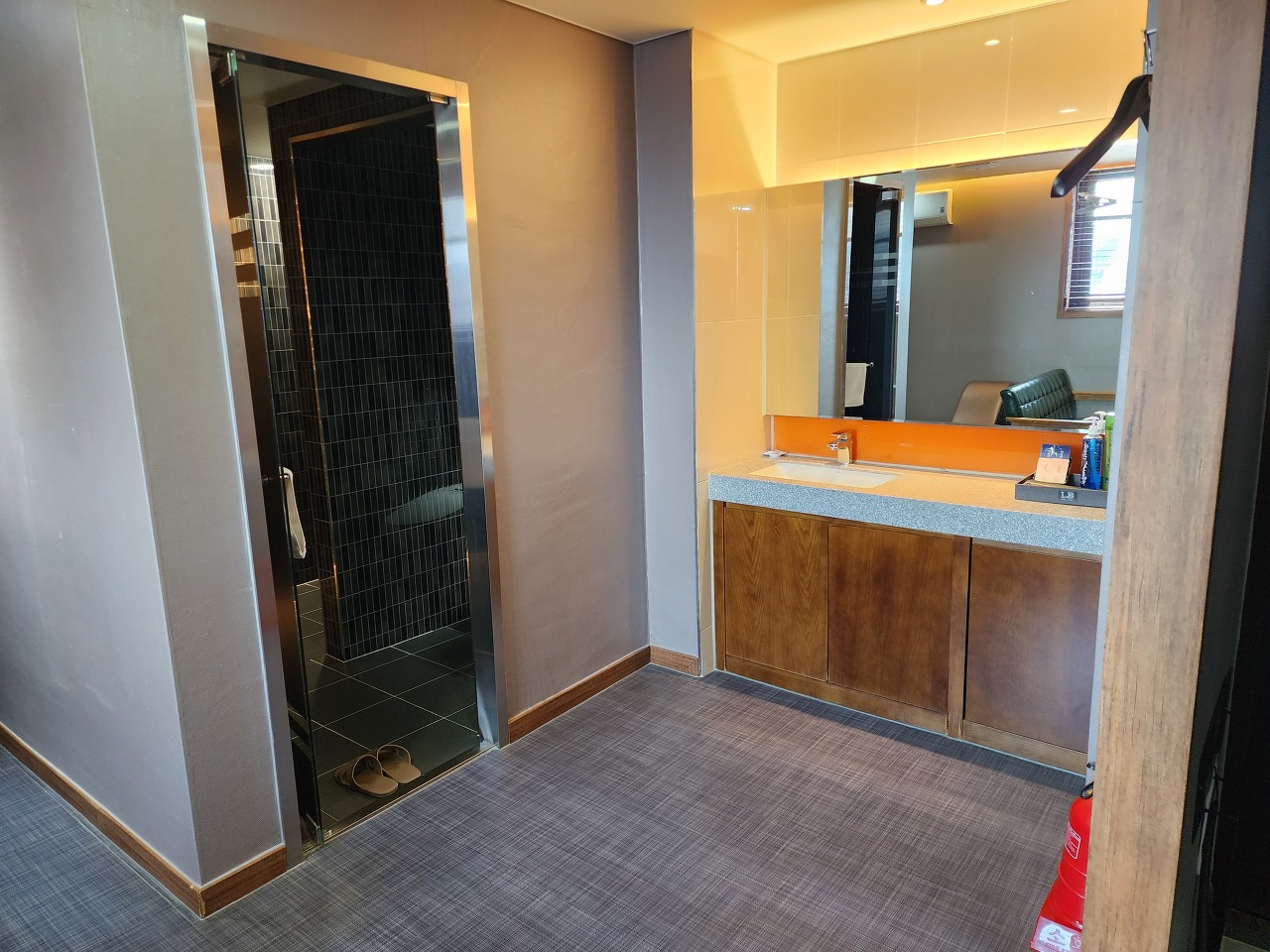 건식 세면대 공간이 쓸데없이 버려져서 아쉽습니다. 욕실에 욕조가 있는 것도 아닙니다. 침대에서 욕실이 보이지 않아서 연인이 씻는 걸 볼 수는 없습니다. 이런 거 안심하시는 분께는 추천.