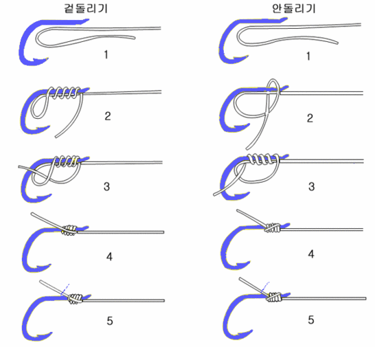 낚시바늘 묶는 법 2가지: 안돌리기 바깥 돌리기