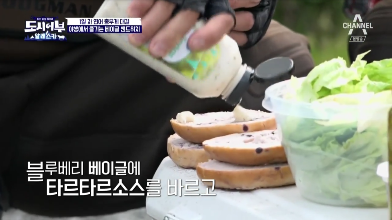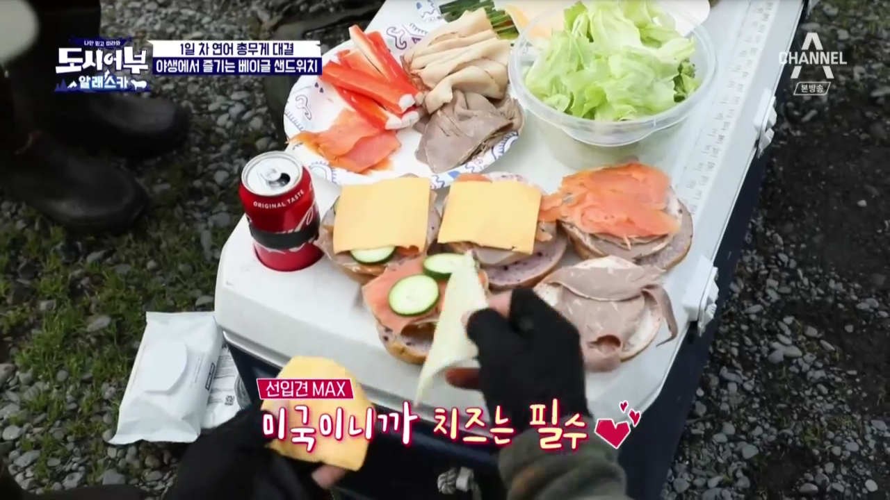 도시어부 알래스카 본편 첫날 점심식사는 베이글 샌드위치군요.