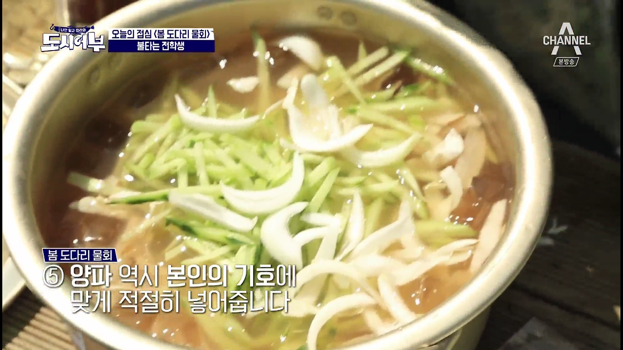 마지막으로, 도다리를 먹기 좋은 크기로 잘라 육수와 함께 서빙하면 됩니다. 봄 냄새와 함께 상큼하고 맛있는 봄 도다리 물회가 완성됩니다.