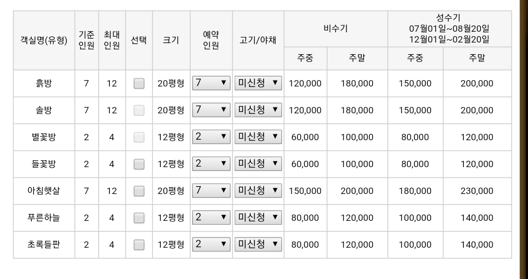 도시 어부 숙소인 솔향기 흙내음 펜션 숙박요금은 다음과 같습니다.