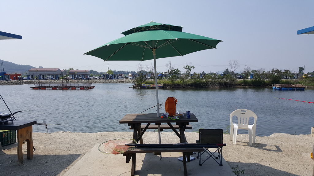그늘 하나 없는 땡볕에 낚시를 하기 힘들어서 관리실에 파라솔을 빌려달라고 했더니 방갈로 사이 자리에는 파라솔을 원래 빌려주지 않는단다.