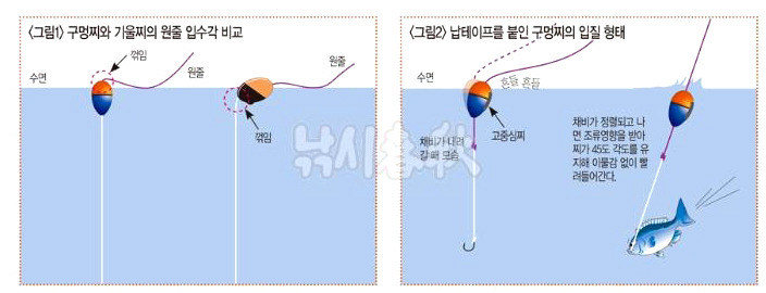 둘째, 납테이프를 부착하면 라인의 입수각도가 완만해져 이물감을 줄이고 채비를 더 쉽게 내릴 수 있습니다. 구멍찌의 옆면에 납테이프를 부착하면 찌가 자연스럽게 45도에서 60도 각도로 기울어져 반기울찌가 됩니다. 이렇게 되면, 원줄이 찌 구멍을 통과하는 각도가 둔각이 되어 라인의 입수가 빨라지고 목줄에 봉돌을 달지 않고도 깊은 수심까지 채비를 내릴 수 있습니다.