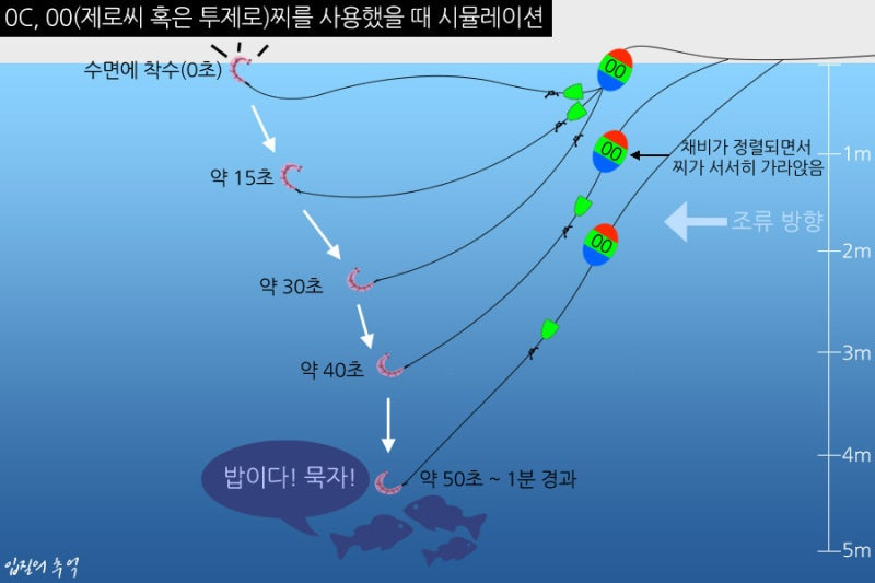 • 조류가 강한 곳에서는 0번, 00번의 마이너스 부력 찌를 활용해 자연스러운 침강을 유도합니다.