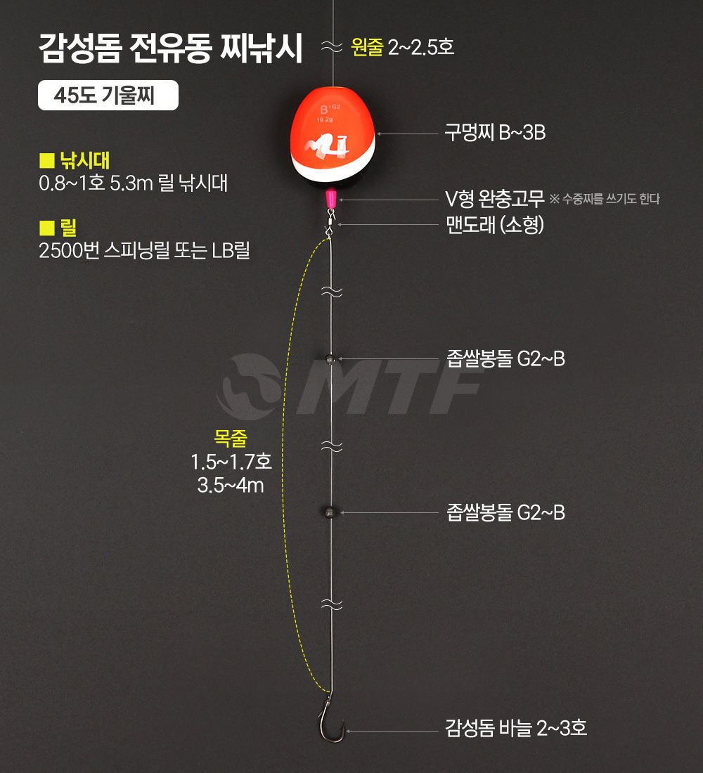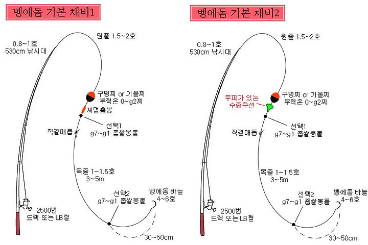 - 구멍찌: G2~3B 부력의 구멍찌를 사용합니다. 구멍찌는 천천히 하강하여 바닥층까지 미끼를 전달하는 역할을 합니다.