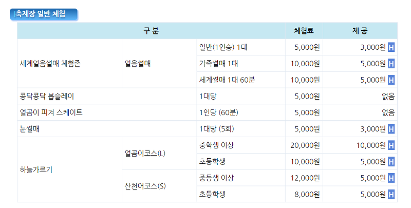 산천어 낚시체험 일반인 15,000원, 우대자 10,000원, 미취학 아동 무료입니다. 우측에 H, C로 표시되어있는 건 H(화천사랑 상품권), C(농특산물 교환권)을 제공한다고 합니다.