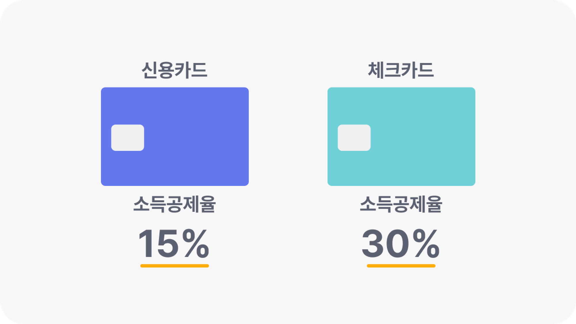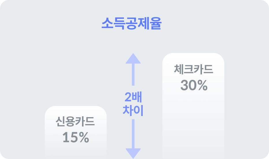 카드로 동일한 금액을 지출했다고 해서 모두 같은 소득공제 혜택을 받을 수 있는 것은 아닙니다. 체크카드와 신용카드의 경우, 공제율이 다르기 때문이죠. 체크카드는 공제율이 신용카드보다 2배나 높습니다. 그래도 신용카드는 다양한 혜택(할인, 적립 등)이 있어 잘 활용하면 유리할 수 있어요.