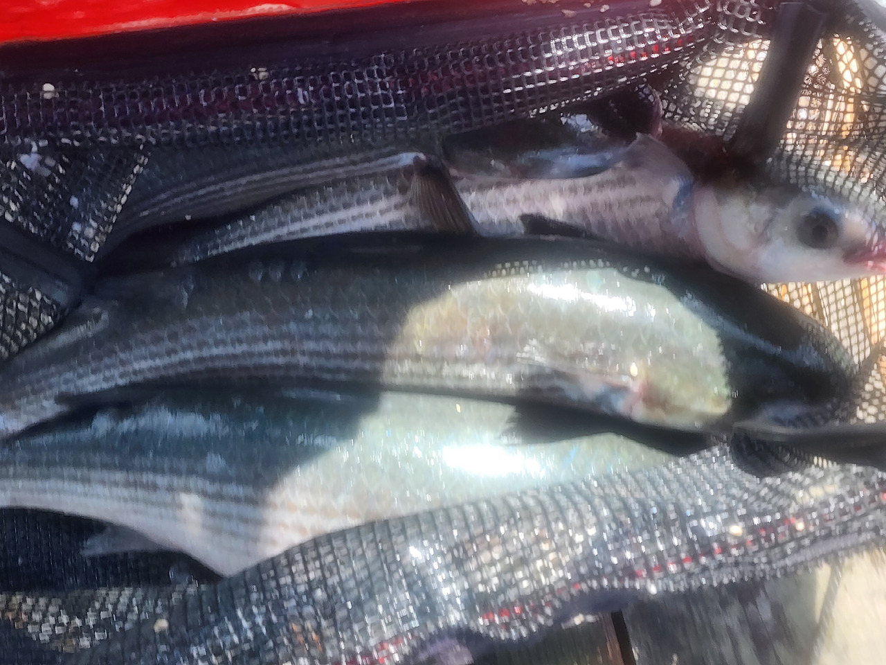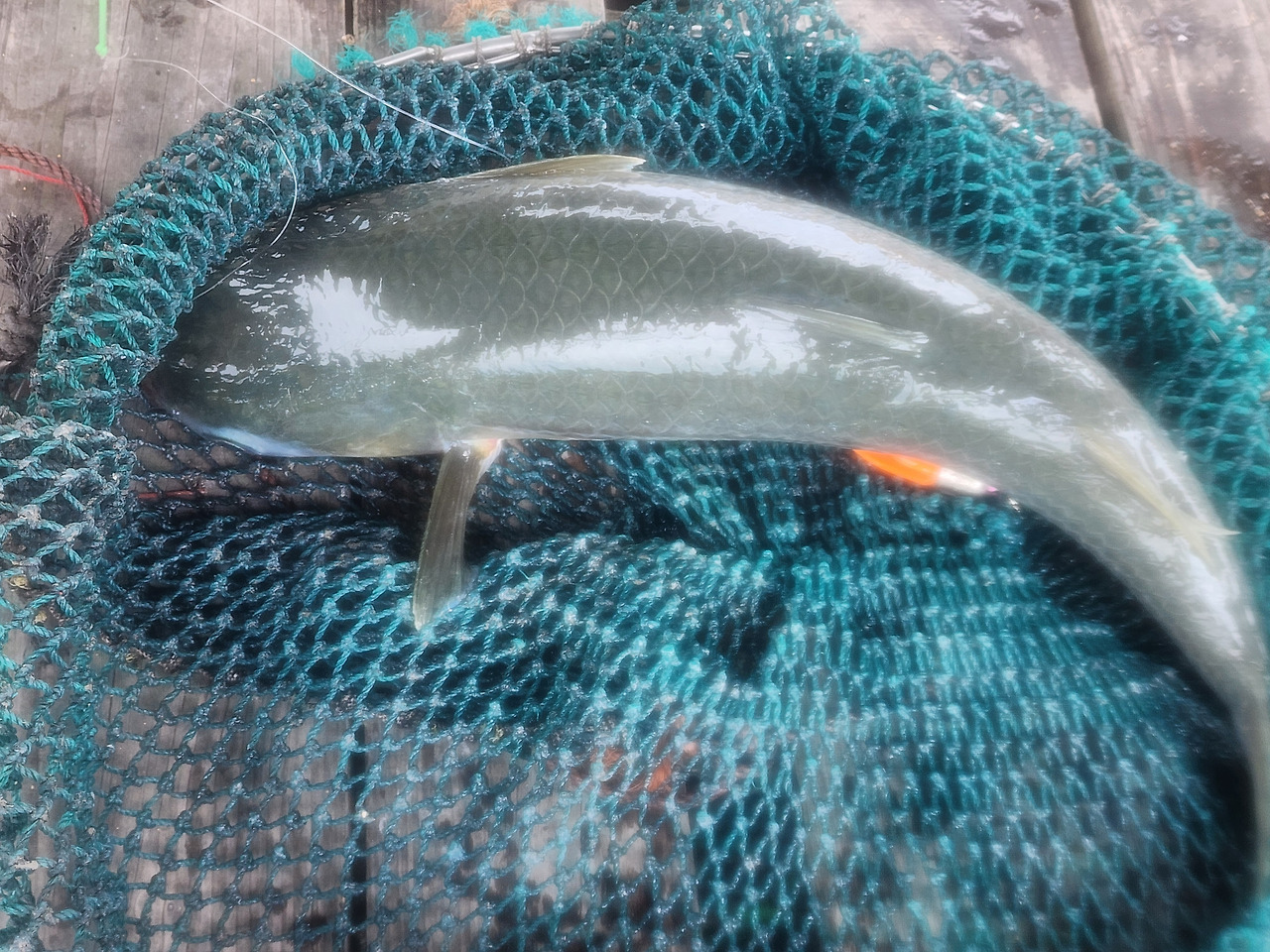 이날 저는 4kg짜리 대형 숭어 한 마리와 보통 크기의 숭어 한 마리를 낚았습니다. 터트린 것도 두 번 정도 있었습니다. 중간에 닭사료 떡밥을 다 써서 새로 보충하느라 시간을 허비하지 않았다면 더 많은 조과를 올릴 수 있었을 겁니다.