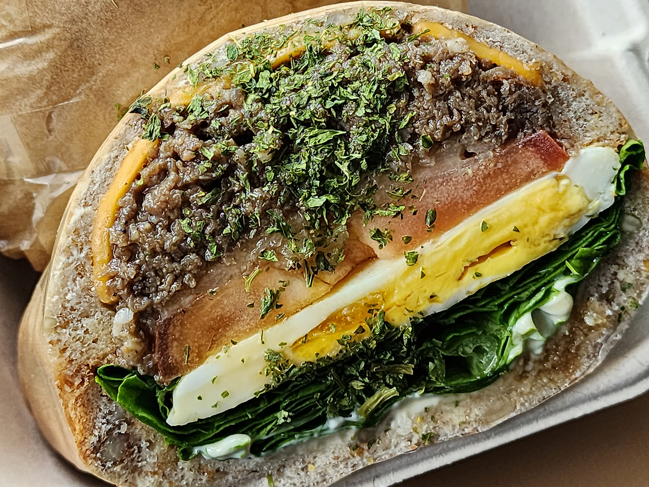 불고기는 잘게 다져져 부드럽게 씹히며, 짭짤하게 간이 되어 후추의 향이 강하게 느껴집니다. 로메인과 토마토가 산뜻한 맛을 더해주어 고기의 깊은 맛과 잘 어우러집니다. 또한, 파슬리가 샌드위치 위에 뿌려져 있어 향긋한 향을 더해주지만, 향에 민감한 분들은 파슬리를 빼달라고 요청할 수 있어 개인의 취향에 맞게 즐길 수 있습니다.