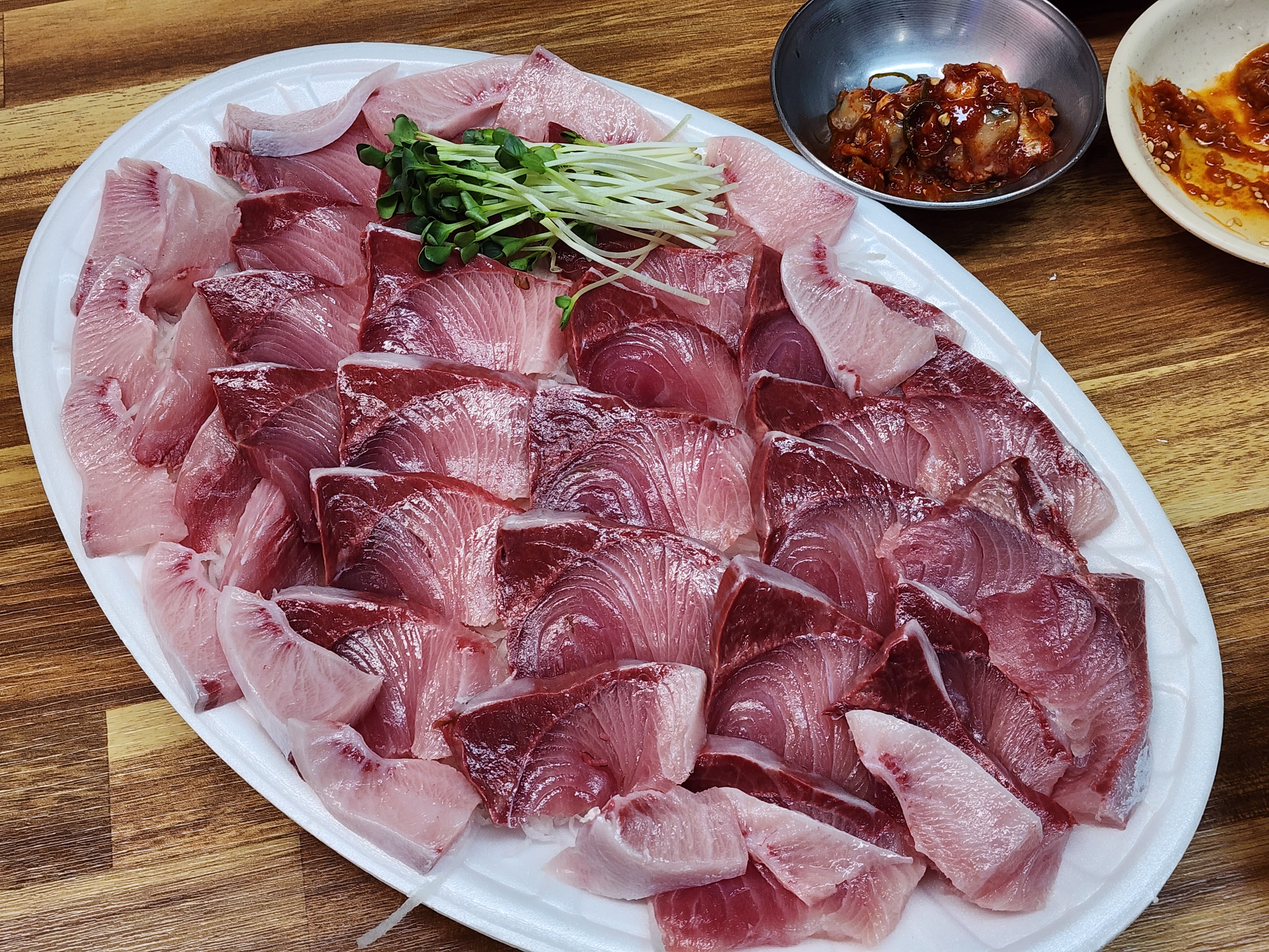 연천 상회에서는 대방어회를 2명이서 먹을 수 있는 분량으로 소짜로 구입했어요. 방어회 가격은 45,000원이었습니다. 대방어는 크기도 커서 부위가 참 다양한데, 소짜로 주문해도 다양한 부위를 담아 줍니다. 소짜로 두 명이 함께 먹기에 충분한 양이었습니다. 아니 오히려 남아서 나중에는 매운탕에 샤부샤부처럼 넣어 먹어야 했을 정도입니다.
