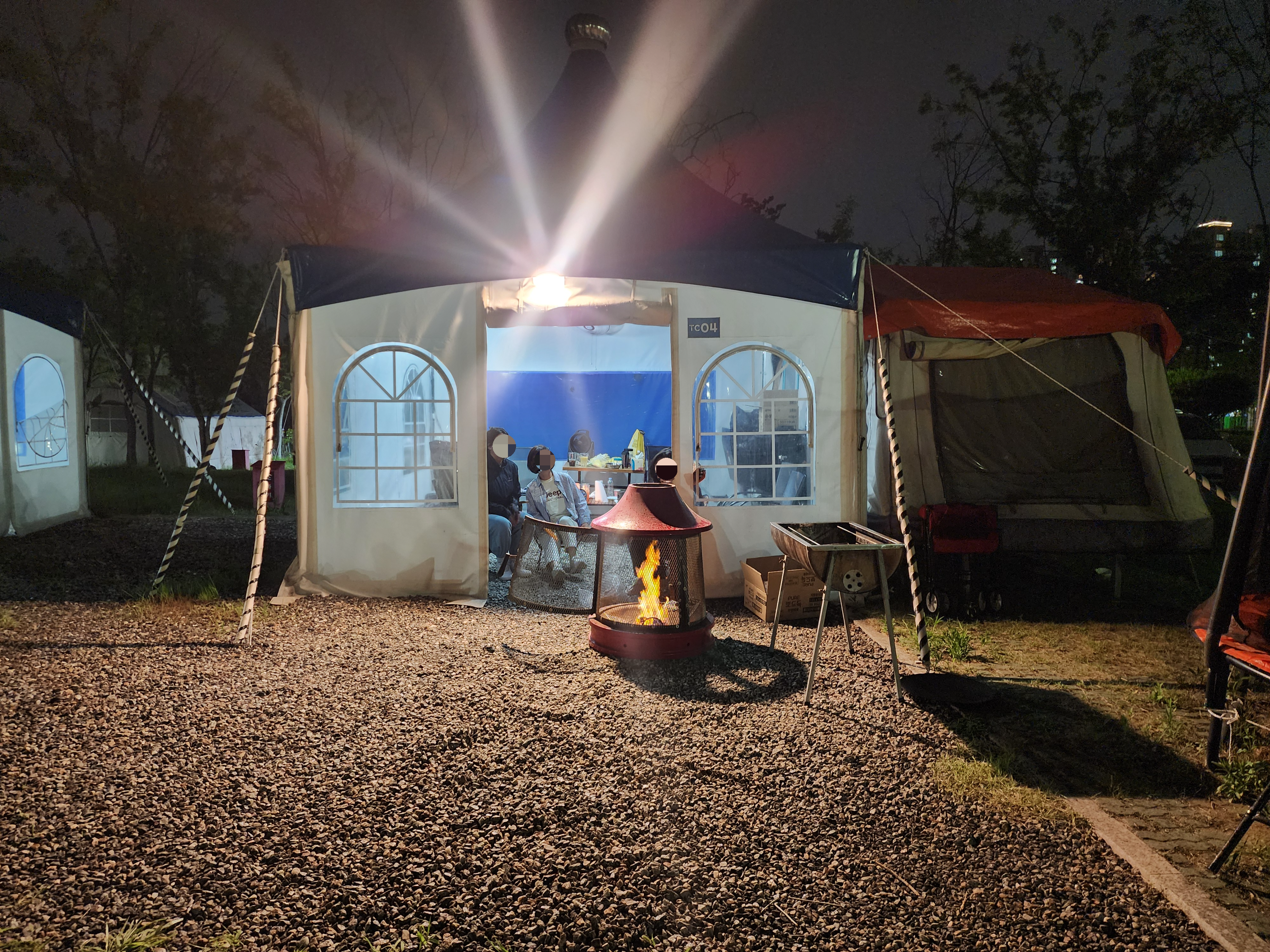 캠핑장 내에서는 장작불 사용이 금지되어 있어 송진을 머금은 탄으로 불멍을 즐겼습니다. 불멍을 위해 장작이 아닌 다른 방법을 선택해야 하는 점이 조금 아쉬웠지만, 전반적인 캠핑 경험은 매우 만족스러웠습니다.