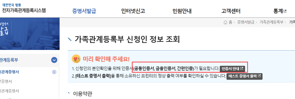 - 증명서 확인 및 출력: 신청을 완료하면 가족관계증명서를 확인할 수 있으며, 왼쪽 상단의 프린터 아이콘을 눌러 출력할 수 있습니다.