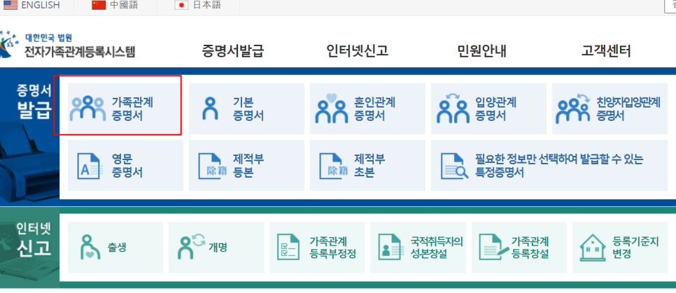 - 가족관계증명서 클릭: 홈페이지에 접속한 후 '가족관계증명서'를 선택합니다.